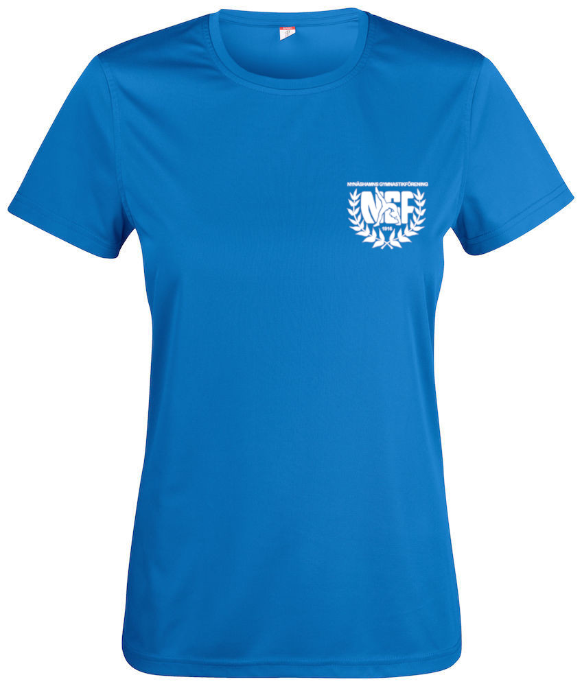 Föreningströja i funktionsmaterial, dammodell, royalblå eller svart med vit föreningslogga på bröstet.